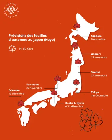 The dates of the koyo depend mainly on temperatures, which vary according to altitude and latitude. Here's an overview of the periods expected in 2024 for the main Japanese regions: