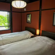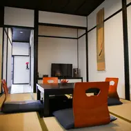 The ground floor of Saigawa house has a comfortable main living / dining room, large kitchen coutner, small private garden and a large bath area with a washing machine and dryer as well. The kitchen table is Japanese style with a heated sunken space so your legs can feel at ease. The mixture throughout the house of the tatami mats, dark wood and white walls gives the house a luxurious feel.