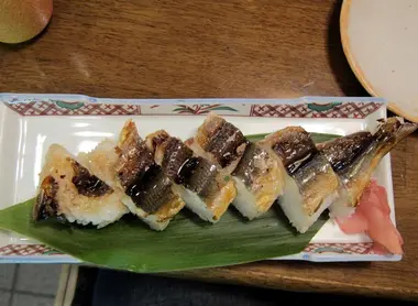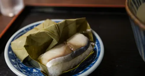 Thus, kakinoha-zushi , which literally means "sushi with persimmon leaf", is a marriage between the sea (the fish), the mountains (the persimmon leaf) and the land (the rice), which makes for an exceptional meal. Traditionally, kakinoha-zushi are made with salmon or mackerel but you can now also find shrimp or eel. They are delicately wrapped in a persimmon leaf, and presented in a wooden box. It's difficult for non-specialists to notice the difference in flavor compared with traditional sushi because it is particularly subtle. To put the odds on your side, opt for the mackerel (saba) kakinoha-zushi , a white fish that is more easily absorbed by the delicate aroma of persimmon leaf.