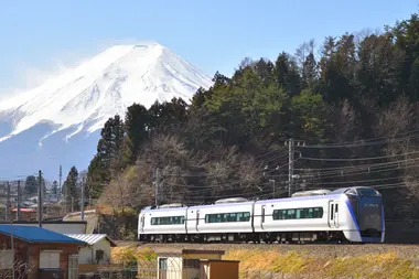 Both routes bring travelers into the broader Fuji region, where scenery becomes increasingly dramatic as the train approaches the mountain. Depending on weather conditions, passengers may see Mount Fuji rising above forests, rivers, and rural towns, often appearing suddenly as the train turns or clears a ridge.