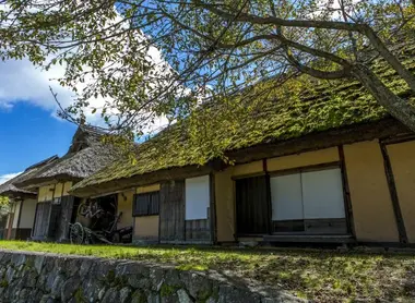The house, with a thatched roof , contains many rooms, all furnished and furnished in the traditional Japanese style . A large room, acting as a living room, even has an iori , a traditional Japanese fireplace , around which the different members of a family meet to chat on winter days or evenings.