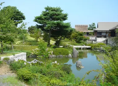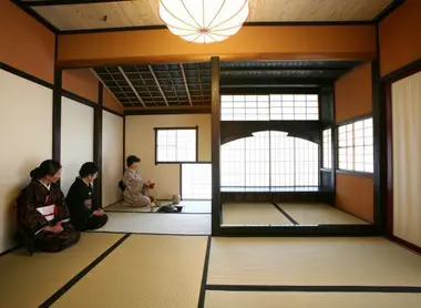 The tea house is in a garden which is also a reproduction of the East Garden of the Imperial Palace, Sento Gosho, in Kyoto , as it was in the seventeenth century. Before entering the teahouse you will cross a wooden bridge, a transition between the modern buildings of the museum and the past in the offices of Kobori Enshu.