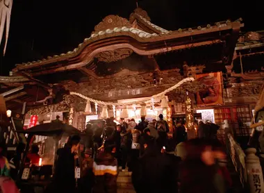 It's dedicated to the worship of tengu, creatures from Japanese folklore with long noses. Yes, shinto gods are worshipped in this Buddhist temple. No, don't try to understand why; in a country like Japan with such ancient traditions sometimes faiths overlap.