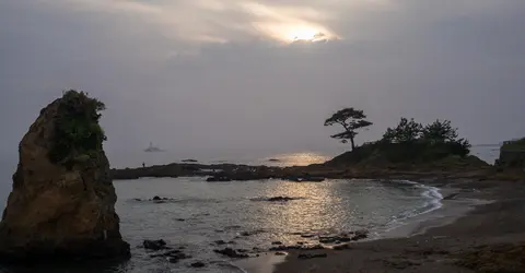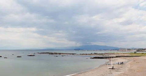 It is a long beach of golden sand and in summer it is the most lively of the beaches in Hayama. Gargotes (called umi no ie "houses by the sea") and bars welcome summer visitors while lifeguards watch over swimmers. At the end of the beach, on the left, the Morito jinja Shinto shrine overlooks the sea. On the other side, there is a small cove from which, on a clear day, you have a superb view of the island of 'Enoshima, the Hakone Mountains and Mount Fuji. The small red torii lost in the distance among the rocks completes this enchanting landscape , especially at sunset.