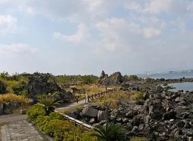 À 800 mètres au sud débute le Nagisa Lava Trail, un charmant chemin côtier créé sur les vestiges de la coulée de lave de 1914 et menant au point d’observation Karasujima. Un bus permet ensuite de monter jusqu’à l’observatoire Yunohira, le plus au point accessible par les visiteurs, à 373 mètres d’altitude.