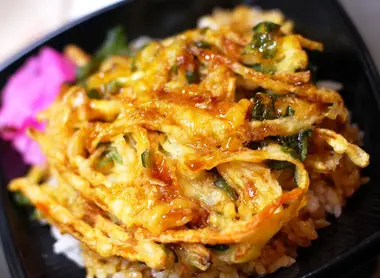 Tempura falls into the category of agemono, deep-fried foods, and the most popular kind is a mixed vegetable pancake (green beans, onions, carrots) called kakiage, usually eaten with a bowl of rice.