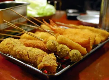 Kushikatsu, skewered meat and vegetables, are also a very popular fried food, but they differ from tempura in that they are dipped in breadcrumbs before frying. It's similar to the popular tonkatsu, fried pork cutlet, which is one of many everyday, home-style dishes (katei-ryori) like donburi and udon.