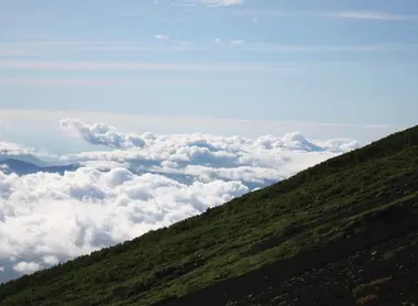 Beide Wege haben ihre Vorteile. Brechen Sie aber am Nachmittag auf, so können Sie beim Aufstieg das herrliche Panorama genießen und am Ende den Sonnenuntergang bewundern, um den zwar viel weniger Brimborium gemacht wird, der aber genauso unvergesslich ist wie sein morgendlicher Bruder. Sie durchbrechen insbesondere die Nebelgrenze und lassen den grauen Dunst hinter sich, der Sie schon seit ganz unten verfolgt. Bei der sechsten Station erstrahlt plötzlich der Himmel in tiefstem Blau, zwischen zwei Wolken erkennt man die Region Hakone, der Horizont bietet seine schönsten Trümpfe dar.