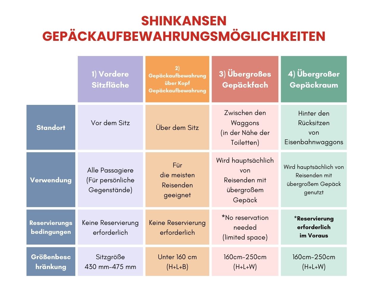 Dieser befindet sich hinter den hintersten Sitzen des Shinkansen-Wagens. Für diesen Stauraum sind Reservierungen für die entsprechenden Sitze erforderlich.