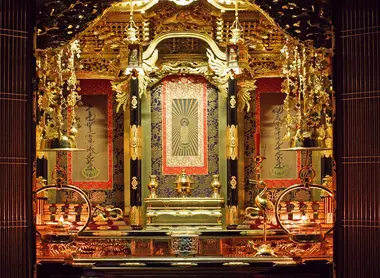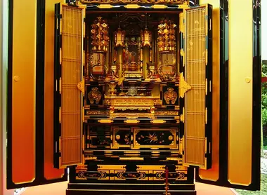 Der Butsudan präsentiert sich als ein reichlich ausgeschmückterSchrank, in dem zumeist eine Gohonzon genannte Buddhastatue thront.Manche sind mit einer Mandala genannten Schriftrolle ausgestattet.