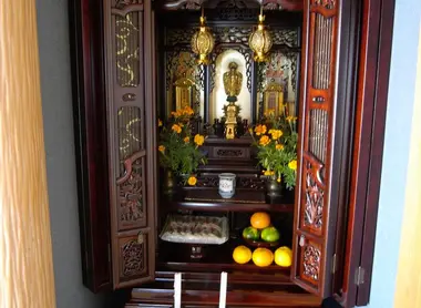 Als Buddhisten vergöttern die Japaner ihre Ahnen. In japanischenHäusern ist es der Butsudan, der als kleines Heiligtum dazu dientdie täglichen Riten durchzuführen.