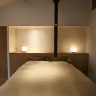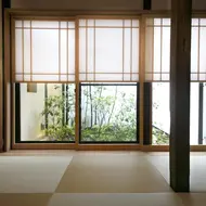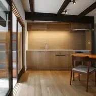 Bei der Renovierung dieser Machiya wurde, entgegen den Prinzipien der traditionellen japanischen Architektur, Wert darauf gelegt, den Raum zu öffnen und so viel Licht wie möglich hineinzulassen. In diesem Sinne wurden bei der Renovierung des Innenraums Oberlichter eingebaut, Wände entfernt, Balken freigelegt, Decken geöffnet und beige und hellbraune Farbtöne sowie elegante Naturmaterialien gewählt.