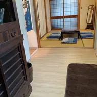 En la planta baja, hay un salón de estilo japonés, cocina, cuarto de baño, lavadora y WC. Puedes cocinar en la cocina occidental totalmente equipada de este alojamiento en alquiler de vacaciones en Kioto y disfrutar de tu comida envuelto en el ambiente agradable del típico comedor japonés.