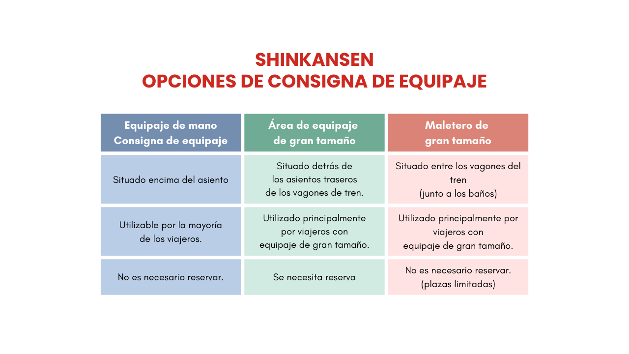 Los trenes de alta velocidad Shinkansen y otros expresos especiales, como el Narita Express o el Skyliner, disponen de zonas específicas para guardar el equipaje. Sin embargo, hay normas especiales que deben respetarse a la hora de guardar el equipaje.