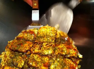 Este plato imprescindible, especialidad local, se llama okonomiyaki. A menudo descrito como una tortita de col muy gruesa, se prepara y cocina ante sus propios ojos, y puede adaptarse a su gusto (con tiras de cerdo, sepia, patatas, huevos, queso, algas, etc.).