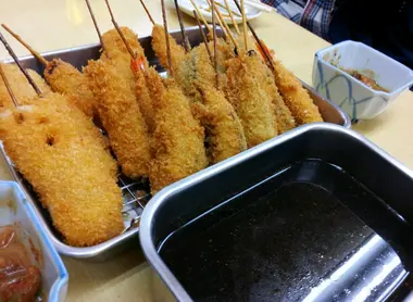 El kushikatsu son brochetas de carne, verduras o marisco fritos. Es el plato estrella de Shinsekai Pero antes de probar cualquier kushikatsu, hay que recordar una regla importante. Acompañadas de hojas de col, estas brochetas se mojan en una salsa colocada en pequeños recipientes que utilizan todos los clientes. Por lo tanto, ¡está estrictamente prohibido mojar el kushikatsu en la salsa por segunda vez después de haberlo mordido! La cadena de restaurantes Kushikatsu Daruma se fundó en Shinsekai en 1929. Ahora cuenta con cuatro restaurantes en el distrito: Shinsekai Honten, Janjan, Tsutenkaku y Dobutsuenmae.
