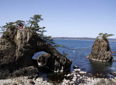 Ces deux rochers sont considérés comme sacrés, c’est pour cela qu’ils sont reliés par une corde, en japonais shimenawa, utilisée dans la religion shinto pour marquer la présence d’esprits sacrés. Au sommet du rocher de gauche, le plus impressionnant, est installé un petit autel, en forme de sanctuaire rouge.