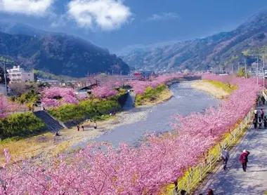 À Kawazu, les touristes viennent surtout pour les sources chaudes mais aussi pour ses cerisiers précoces qui fleurissent dès février, les premiers de la région du Kanto. En remontant vers l’intérieur des terres on pourra poursuivre jusqu’au temple de Shuzenji ou les Sept Cascades.