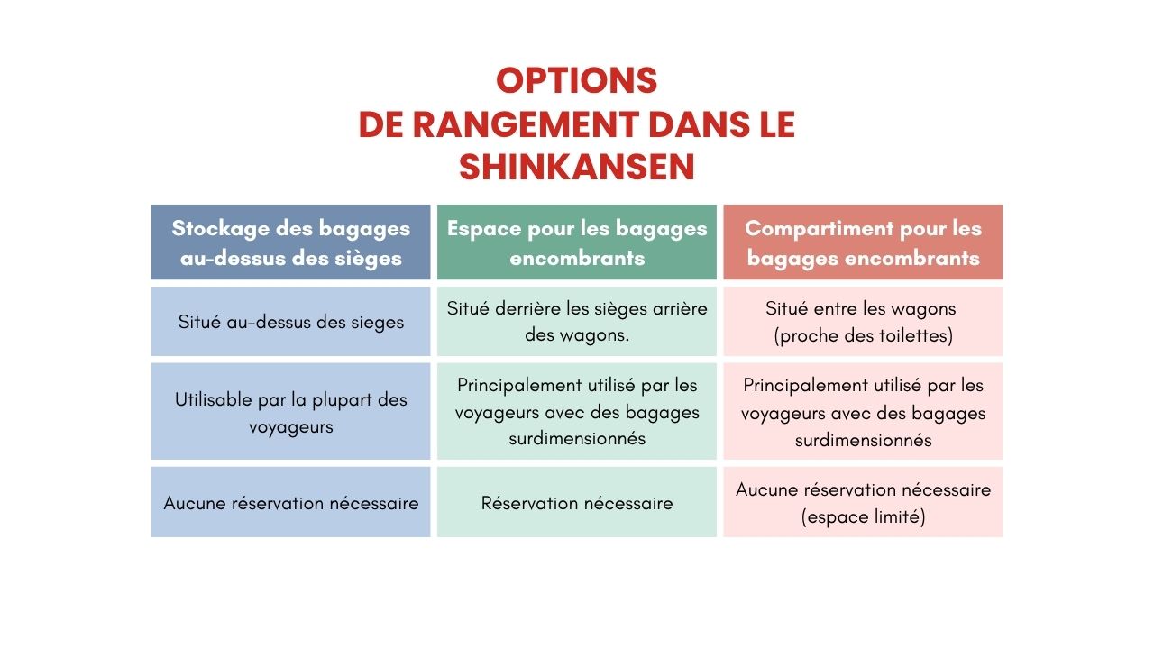 Si vous montez à bord du Shinkansen avec des bagages volumineux, assurez-vous d’abord de vérifier s’il reste de la place dans le compartiment pour bagages encombrants. S’il est complet, lorsque le personnel du train passera pour vérifier les billets des passagers, ceux-ci se verront demander d’acheter de nouveaux billets et d’échanger leur siège contre un siège avec espace pour bagages volumineux, moyennant des frais supplémentaires de 1000 yens. Afin d’éviter ces désagréments et des coûts additionnels, il est conseillé de réserver votre siège avant l’embarquement.