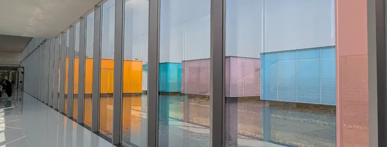 Un grand couloir de 190 mètres et 8 mètres de haut, qui forme de l’extérieur un mur très impressionnant, qui reflète la mer et les montagnes environnantes, relie aux autres bâtiments.