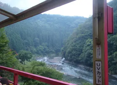 Quatre trains circulent sur cette ligne : trois d’entre euxsont fermés mais le dernier est totalement ouvert pour permettre de mieuxapprécier la douceur de l’air dans la gorge de la rivière Hozu qu’elle suitjusqu’à Kameoka. Le trajet de 7 kilomètres s’effectue en toute tranquillitédurant 25 minutes, qui laissent amplement le temps de photographier et d’admirer.