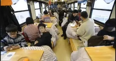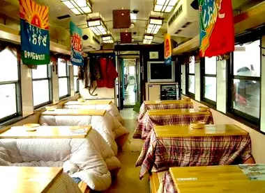 Les kotatsu sont ces tables recouvertes d’une épaisse couverture et sous lesquelles un chauffage vous maintient bien au chaud. Un moyen très traditionnel (et très fréquent) au Japon pour combattre le froid hivernal. Vous trouverez ce drôle de train dans la préfecture de Iwate, dans le nord du Japon.