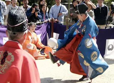 Chaqueannée, le 29 avril et le deuxièmedimanche de novembre a lieu le festival de kemari, kemarimatsuri, faisant revivre cet ancien jeu de balle. À cette occasion, les participants, entre six et huit, vêtus en habits de cour comme il y a plus d’unmillénaire, s’évertuent d'empêcher avec leurs pieds qu'un ballon en peau dedaim (mari) touche le sol. Une fois lejeu officiel terminé, les spectateurs peuvent se joindre aux joueurs.