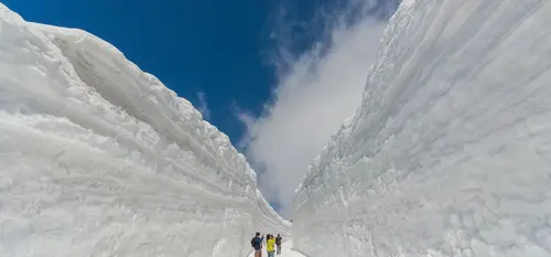 Les chasse-neige ouvrent la seule route entre la ville de Tateyama et le plateau de Murodo, l'étape la plus élevée de l'itinéraire. Le déneigement crée la fameuse "vallée des neiges", ou Yuki-no-Otani. La marche dans le canyon, dont les parois atteignent parfois plus de vingt mètres de haut, n'est qu'une des nombreuses expériences que vous pourrez apprécier au cours de ce voyage incroyable !