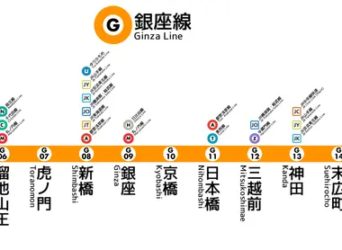 La ligne Ginza traverse tout le centre de Tokyo, ses quartiers les plus célèbres autant pour le shopping, pour les affaires que pour le tourisme, comme Asakusa, Ueno, Nihonbashi, Ginza, Shimbashi, Akasaka, Aoyama et Shibuya. Les chiffres considérables de fréquentation s’expliquent aussi par le fait que de nombreux grands magasins de Tokyo aient un accès direct depuis les quais de ce métro. La liste est impressionnante et prestigieuse :