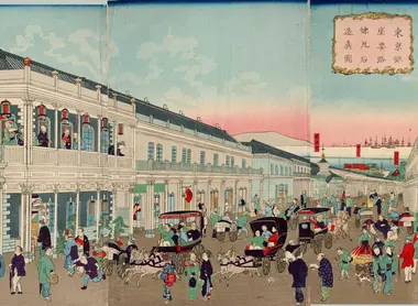 Pour comprendre réellement ce que fut le Tokyo de l’empereurMeiji il faudra se rendre ailleurs. Lagare de Tokyo, restaurée il y a peu, reste encore le plus bel exemple d’architectured’époque Meiji avec ses briques rouges copiant les gares occidentales,autrefois tout le quartier de Marunouchi était bâti sur le même modèle. Nonloin de là le quartier de Ginza fut une des premières réalisations des urbanisteslocaux. Ils transformèrent ce quartier gagné sur la mer en avenue large etpourvue de tramways et de grands magasins avec l’idée d’en faire les ChampsElysées de l’Asie. Témoignage de ce passé, le Ginza Wako, avec sa tour de l’horloge,est un des rares bâtiments à avoir survécu aux bombardements de la deuxièmeguerre mondiale.