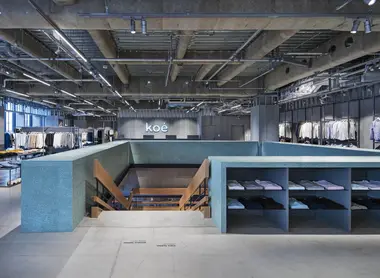 Au 1er étage (2F en version japonaise), un large espace ouvert, le "Koé Shibuya" au design d'inspiration industrielle, propose une collection de prêt-à-porter. La décoration est là aussi sobre et épurée : tons turquoises, béton au sol et aux murs, rayons aérés...