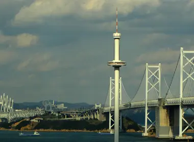 Quelques kilomètres plus loin, la fin du pont arrive, et vous apercevez les "tétons" de Shikoku, ces montagnes caractéristiques de l'île. Sur votre droite, la fine tour Seto Ôhashi du port d’Utazu apparaît. Ne manquez pas d'aller admirer le fantastique panorama depuis le haut de cet édifice. Une nacelle en ascenseur rotatif vous mènera jusqu'au sommet.