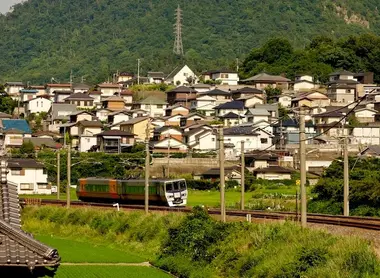 Aux alentours de la gare de Sakaide, les amateurs viennent nombreux pour déguster la spécialité de la région : le sanuki-udon. Quelle bonne introduction pour votre voyage à Shikoku ! La ligne se poursuit vers Takamatsu, dans la campagne entourée de petites montagnes, dont le mont Iino, surnommé le "Fuji de Shikoku".