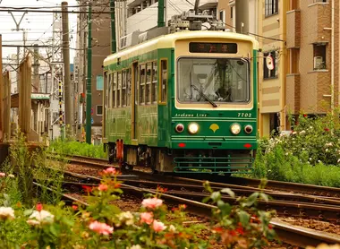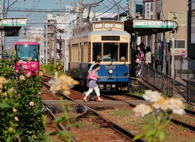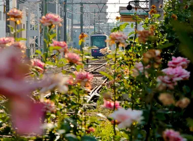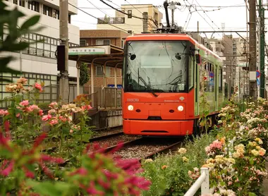- Au départ à Minowabashi : sur les 4 premiers kilomètres 13 000 roses vous accompagnent. Les rosiers sont le symbole de cette ligne. La sympathique galerie marchande Joyful Minowa vous accueille avec ses commerces et restaurants, pour commencer votre aventure par un bon repas.