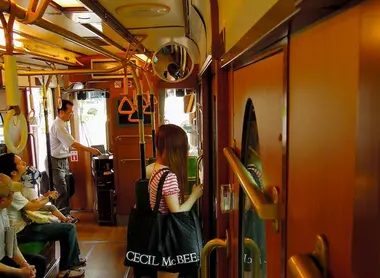 En station vous attendez à la queue leuleu, comme dans toutes les gares japonaises. À l’arrivée du tram vous devez monter par la porte avant et payer immédiatement votre billet au conducteur. Vous descendrez par la porte arrière, ou celle du milieu. Les nouveaux tramways ont tous un plancher bas qui rend l’accès très facile pour tous.