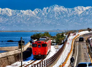 Tout en longeant la baie de Toyama, on peut apercevoir à bord de ces trains les pics enneigés des Alpes japonaises au loin. La station Amaharashi est prisée des photographes pour cette diversité de panoramas en un lieu.
