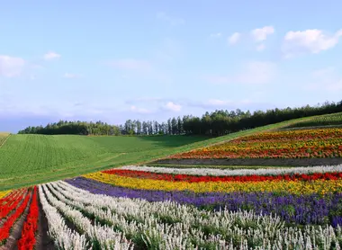 - Tomita farm : Cette ferme est composée de plusieurs zones, où des rangées de fleurs en arc-en-ciel sont disposées. Sur place se trouve aussi un café, où vous pouvez déguster des spécialités locales à la lavande et d’autres plats en admirant les fleurs et les montagnes de Daisetsuzan à l’horizon.