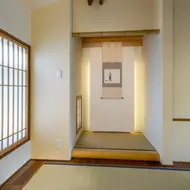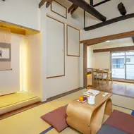 All'interno, le travi in legno del tetto sono state ricostruite aumentandone i volumi, piccoli lucernari costellano il soffitto della sala da pranzo come "finestre sul cielo" (tenmado) e un giardino in miniatura (tsubo niwa), fatto di pietre e baffi di drago (ryu no hige), invita alla quiete.