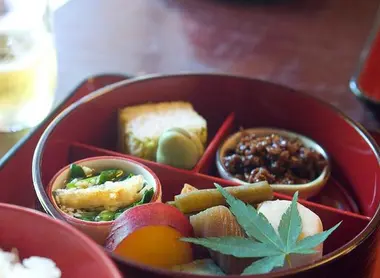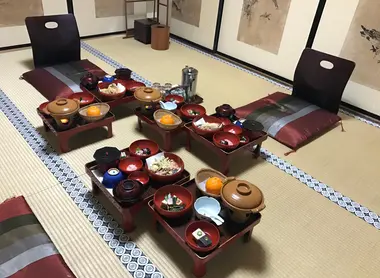 Ci sono anche molte preparazioni diverse di tofu (in fogli, cubi, fritti, zuppe ...) e un'altra sostanza simile, da non confondere con il tofu, che si chiama yuba (nata latte di soia bollente ). Si usano spesso piccoli fiori o foglie che guarnite i piatti. Un brodo di dashi a base di alghe e una ciotola di riso bianco accompagnano naturalmente ogni pasto.