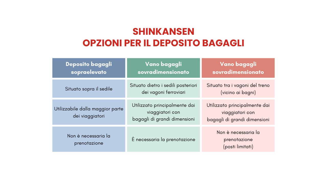 - Vano bagagli di grandi dimensioni: situato tra i vagoni del treno Shinkansen, vicino al bagno. Si tratta di spazi dedicati al deposito dei bagagli, ma funzionano in base all'ordine di arrivo.