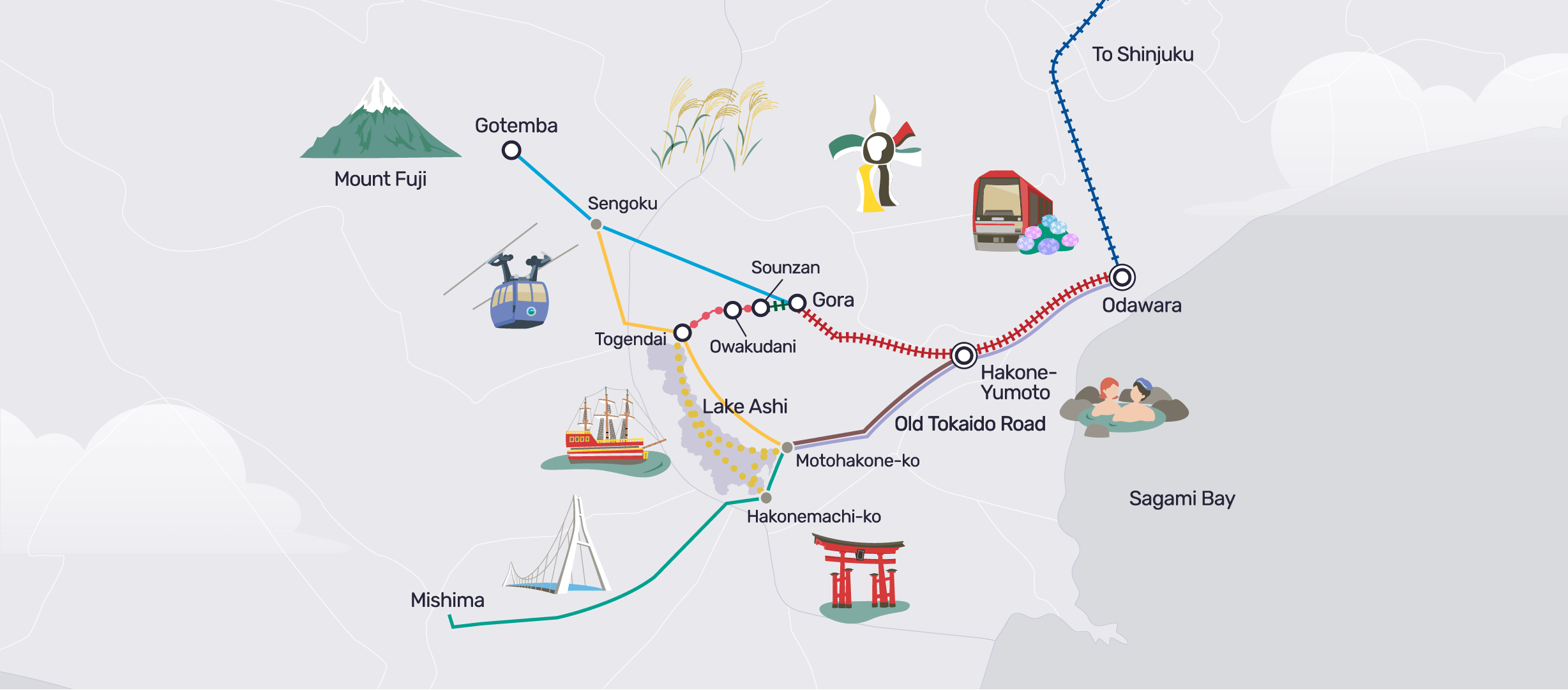 L'Hakone Freepass è un Japan Rail Pass regionale, un biglietto scontato per un’escursione tra Shinjuku e Hakone-Yumoto, che offre una copertura completa delle destinazioni turistiche più popolari di Hakone. Con l'Hakone Free Pass, prova il famoso resort termale (Onsen) ai piedi del Monte Fuji da Tokyo e goditi viaggi illimitati risparmiando denaro. Quello che spesso sarebbe una gita di un giorno da Tokyo può ora essere un'escursione di più giorni.