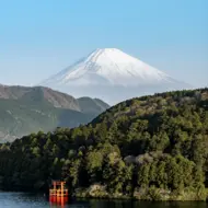 The iconic torii gate of Hakone Shrine, set on the shores of Lake Ashi, is one of the most photographed landmarks in Hakone. Standing partly in the water, it marks the entrance to the sacred shrine and symbolizes the passage into a spiritual space.