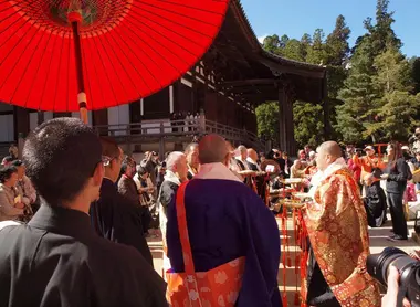 Sitratta di una delle più antiche usanze spirituali di Koyasan. Kobo Daishi (chiamato anche Kukai,fondatore della setta Shingon e di Koyasan), avrebbe partecipato di persona aquesto evento all’inizio del IX secolo. Laprocessione si svolge tra il Daie-do e la sala Kondo, all’interno dellaquale la cerimonia termina sulle note degli affascinanti Shomyo (canti buddisti).