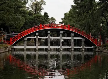 Oltre al Honden, l'edificio principale, il sito comprende una collezione di settecento lanterne in pietra (luci che salvavano la vita nella nebbia marina?) e un affascinante ponte ad arco nel parco, il Taiko-bashi. Osaka nasconde gemme rare. E una visita ordinaria può diventare.. una scoperta piena di preziosi dettagli.