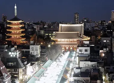 Dalla terrazza al 8°piano si può godere di una magnifica vista sulla famosa Kaminari-Mon e sul Tempio di Sensoji di Asakusa, due mete da vedere durante un viaggio a Tokyo.