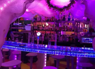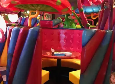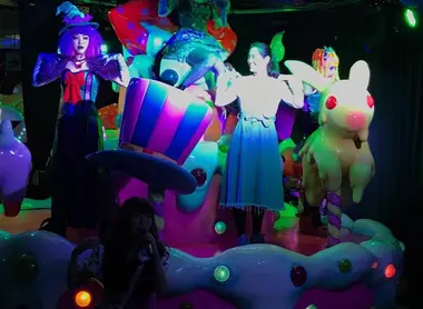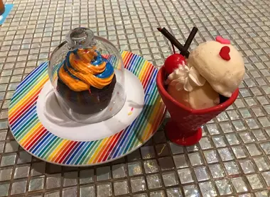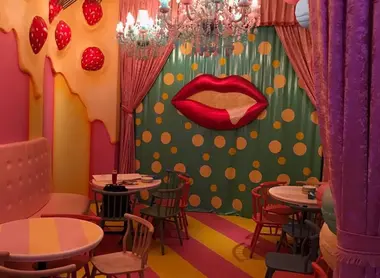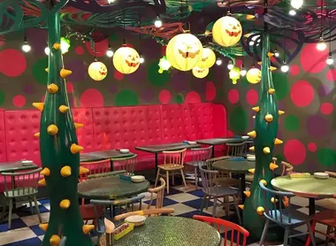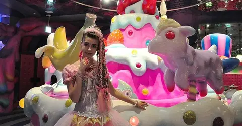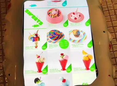 Attraversando la porta del caffè si entra letteralmente nelle fauci del mostro! Un personaggio molto bello, chiamato Mr. Chopsticks Choppy per gli amici. Kawaii Mostro Cafe è un vero e proprio shock visivo! Lo spazio centrale è occupato da una giostra a forma di torta gigante e prelibatezze che regolarmente si trasformano in un palcoscenico per i visitatori. Cinque signorine vi danno il benvenuto, danzano per voi, fanno selfie vengono a parlare con voi al vostro tavolo. In Twitter è possibile seguire le loro notizie. Il locale può ospitare circa 200 persone ed e' diviso in quattro zone distinte: la discoteca Mushroom con piante di grandi dimensioni e funghi psichedelici, lo stand Latte dove i conigli, le pecore e gli unicorni bevono dalla loro bottiglia di latte, il latte Tea Room che trova cioccolatini decorati ed amaretti ed infine il bar annesso con una creatura enorme sottomarina. Kawaii Cafe menu Monster è un'esplosione di colori! Qui gelato, dolci, bevande e paste hanno il colore del cielo arcobaleno.