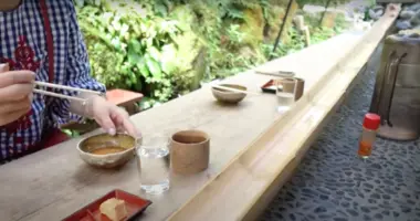 This is really the all-important festive side of nagashi-somen. So, why not do it at home, with family or friends? After all, that's what the Japanese do! Simply install a long sloping slide of bamboo in the garden or in the street. Fix a jet of cold water at the top to flow down the improvised water slide. Diners sit on either side of the bamboo slide, equipped with a bowl of dipping broth and a pair of chopsticks. Choose someone to sit by the water jet and release handfuls of pre-cooked noodles down the slide. You know the rest!