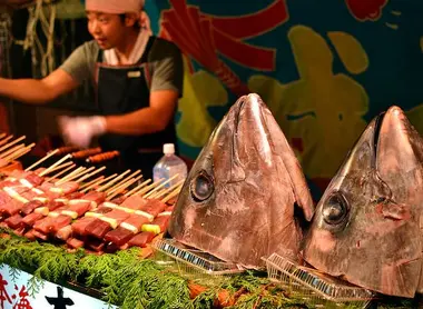 Osaka also offers other seafood specialties such as ikayaki, a thick pancake made from chopped cuttlefish and egg, topped with a brown sauce similar to that of okonomiyaki. You can also enjoy a variety of skewers: octopus, scallops or grilled fish can be enjoyed directly in the busy streets or at the Kuromon Ichiba market.