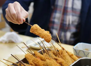 To enjoy kushikatsu like a true Osakian, you need to dip them in a dark, sweet sauce served in a small communal container. But beware of local etiquette: it' s strictly forbidden to dip your skewer a second time after you've tasted it! If you need more sauce, use the fresh cabbage leaves usually served as a side dish.