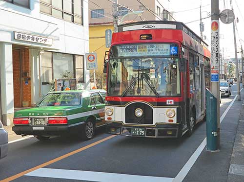 The red and white retro-styled Tozai Megurin is a community bus service around Taito-ku in Tokyo. One of the four Megurin services is the Tozai Megurin Bus Yanaka.